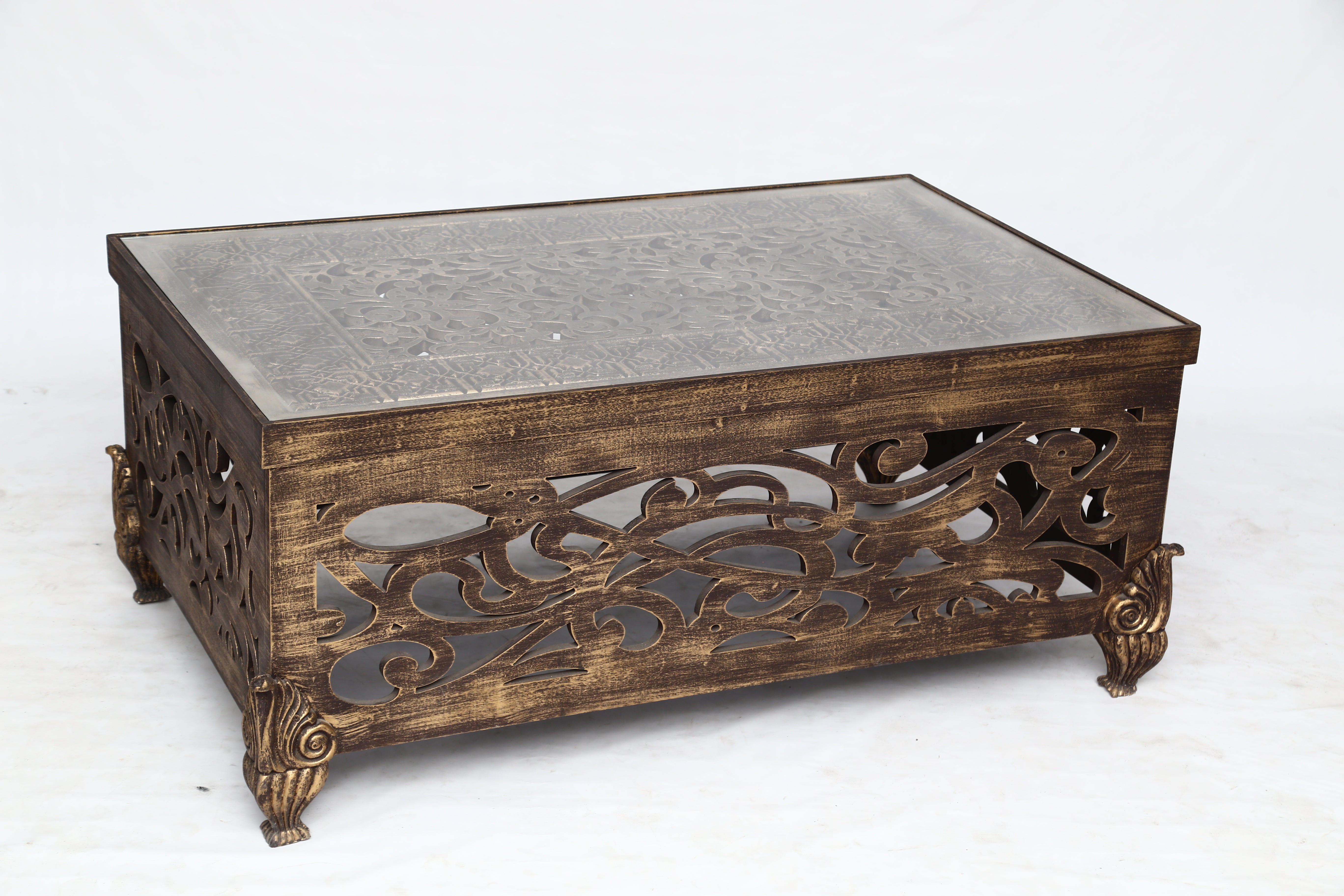 This striking center table is a fusion of rustic and ornate styles, making it a distinctive piece of furniture for any living space in Lahore. The rectangular table features a textured, antiqued gold or bronze finish that gives it a vintage, weathered appearance. The sides are intricately cut with a flowing, decorative pattern, creating a sense of depth and artistry. The table is supported by four detailed, sculpted legs that further enhance its classical appeal. Topping the table is a clear glass surface that allows the beautiful craftsmanship of the base to be visible from above, while also providing a smooth, easy-to-clean surface. This unique table is a perfect choice for those looking for a functional and artistic piece to complement their home decor in Pakistan.